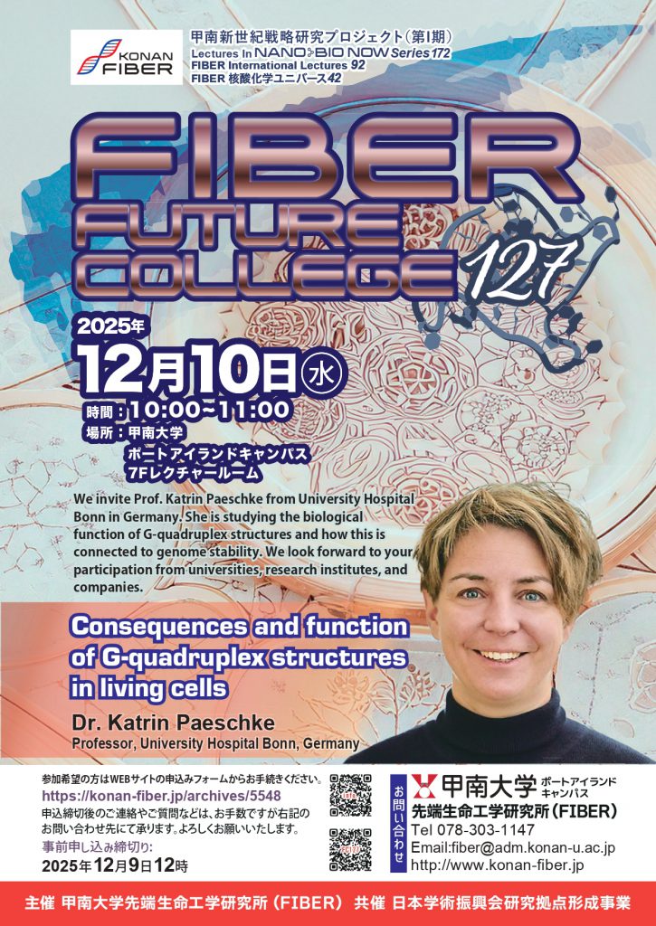 この度のFIBER Future College127では、ドイツ、ボン大学病院のKatrin Paeschke教授をお招きして講演をしていただきます。Paeschke教授は、細胞内におけるDNAおよびRNA構造の意義と機能に関する研究を展開しています。特にグアニン四重らせん構造が細胞内でどのように感知され、ゲノム安定性や免疫応答に及ぼす影響の解明をすすめておられます。疾患やウイルス感染、さらには医療応用研究の分野で世界的に著名な研究者の講演を聴講できるまたとない機会です。皆様のご参加をお待ちしています。