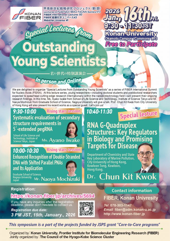 この度、FIBERは「若い世代の特別講演会」を開催いたします。本講演会では、ナノバイオテクノロジー分野において、将来、国際的に最先端研究を牽引することが期待される若手研究者(博士課程学生、ポスドク研究員を含む)に、最新の研究成果を発表していただきます。今回は、東京科学大学生命理工学院の井分 彩乃様と名古屋大学大学院理学研究科の望月 尚也様をお招きし、講演いただきます。また、香港城市大学の Chun Kit Kwok 教授にも特別講演をしていただきます。皆様、ぜひご参加ください。