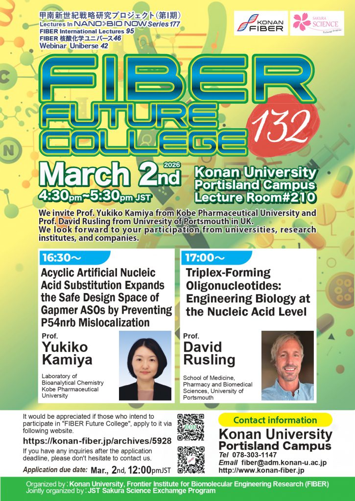 We invite Prof. Yukiko Kamiya from Kobe Pharmaceutical University and Prof. David Rusling from Univresity of Portsmouth in UK. We look forward to your participation from universities, research institutes, and companies.